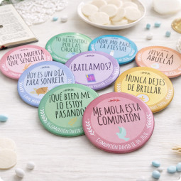 · Pack 25 Unds. Chapas imperdible personalizadas con nombre y fecha.